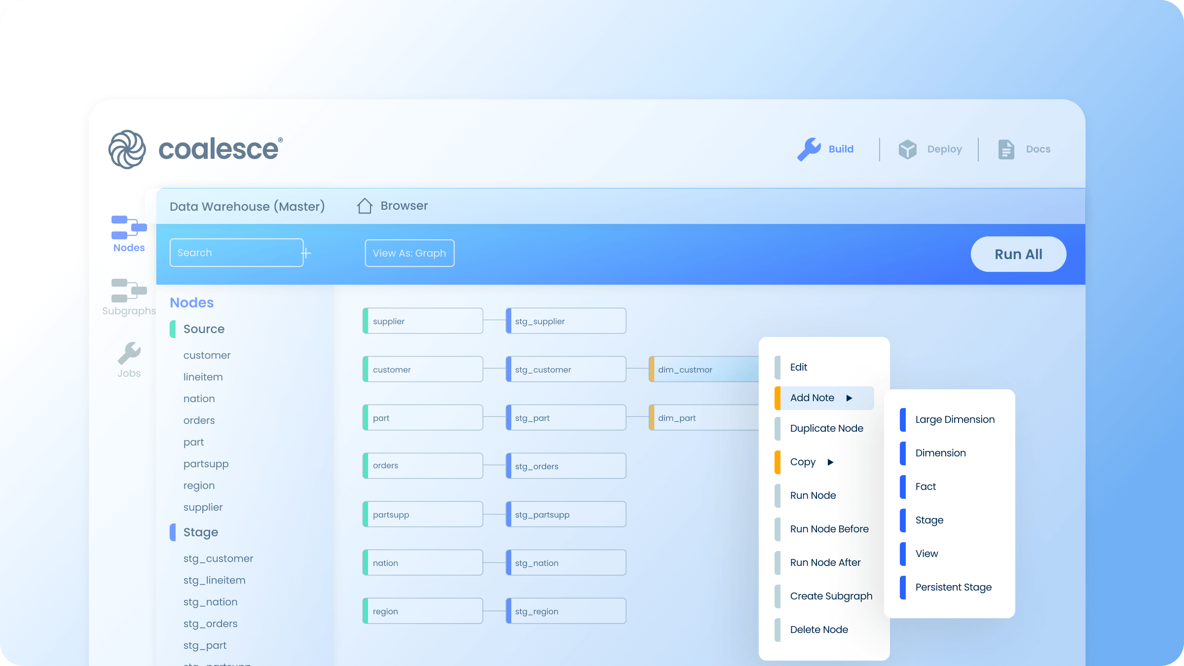 Bake governance, contracts, SLAs, testing, and approvals into everyday development. Coalesce gives you column‑level lineage from data sources through to BI and semantic layers, allowing you to certify products and trace every change.